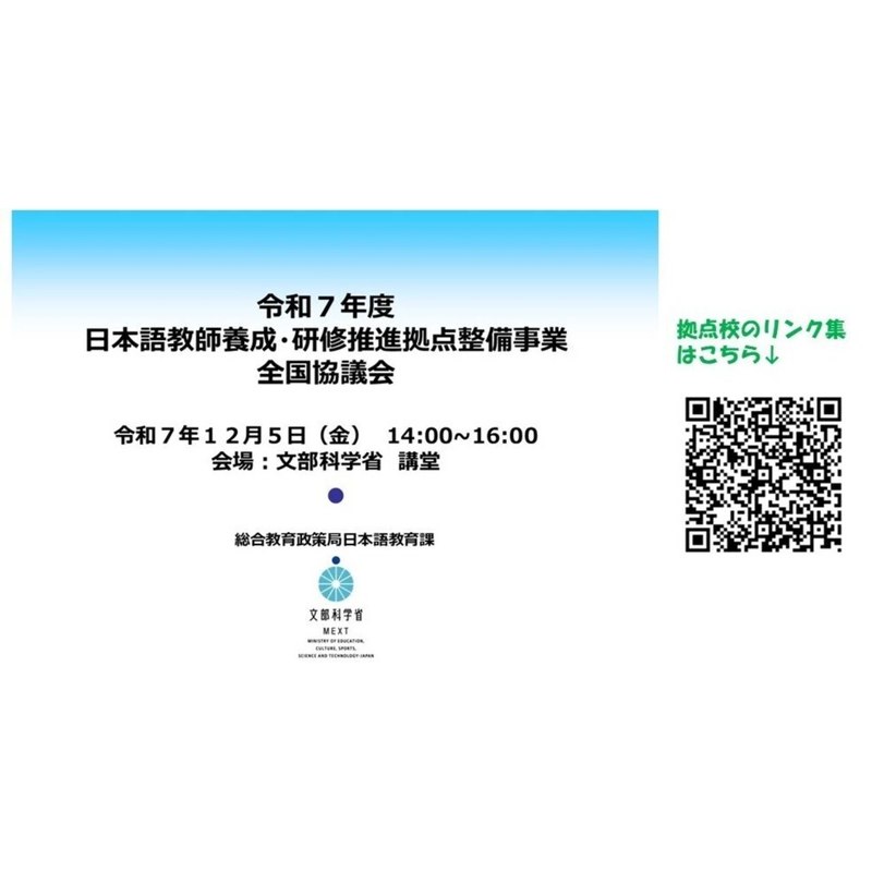 2025年12月5日に開催された令和7年度「日本語教師養成・研修推進拠点整備事業全国協議会」の動画が公開されました。文部科学省の『日本語教育note』よりご覧ください。